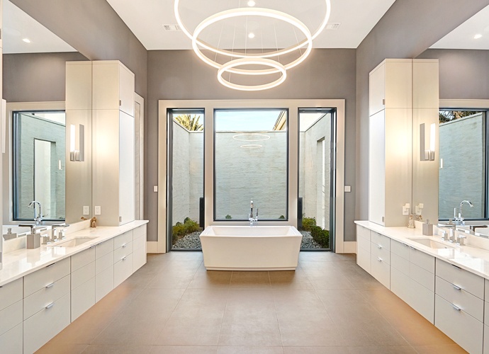 With plush upholstery and soft light emanating from statement-scale fixtures, the master suite fills an entire wing of the home. The master bathroom is the crown jewel of the home with a sleek openness that draws the eye to a spectacular focal point – the space beyond the room. It is admittedly unusual for a master bathroom to feature a full wall of glass, but here the private courtyard enclosure provides a luxurious natural balancing point for the ultra-contemporary, very symmetrical space.