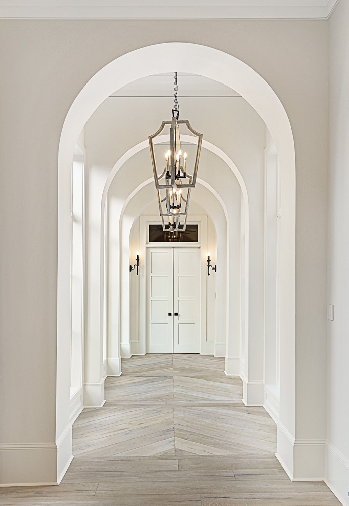 Just walking inside from the family entrance is a transportive experience. The mudroom is less about mud than it is about life clad in beauty – custom floor-to-ceiling cabinetry houses the evidence of activity – and the view down the front loggia is reminiscent of European antiquity. The row of arches that form the front hallway are positioned as the main artery of the home; rather than being hidden in the middle of the structure, this corridor is filled with light.