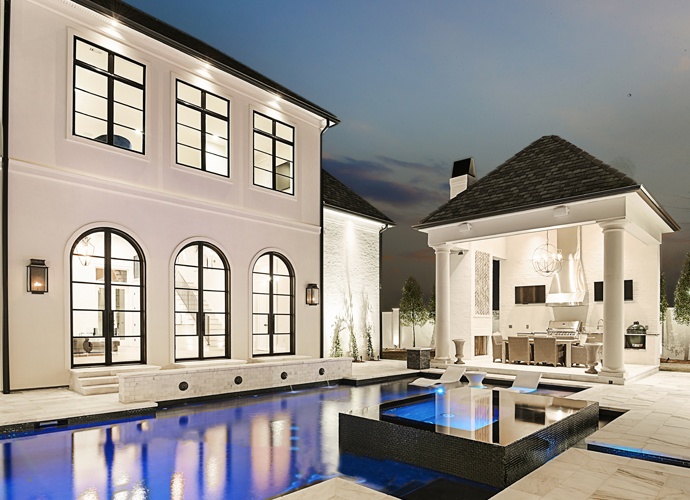 Go a few steps in the other direction and you’ll be drawn to the view down the terrace that leads to the pool. Large sliding doors provide a crystal-clear view of the striking white marble patio and the gently bubbling fountain that drowns out any noise that might remind one of the rest of the world. To one end, the outdoor kitchen caps the visual length of the pool with simple columns and height that stands up to the surrounding structures. Even the color palette here remains true to the rest of the house – all simple white stone with black accents, nothing jarring. The integrated hot tub is clad in graphite-colored mosaic tiles, and the deep blue-gray color of the pool gives an air of mystery and the look of endless depth. In the evening, this spectacular outdoor space is showcased with lighting and creates the perfect venue for entertaining family and friends.