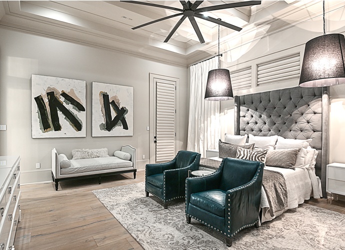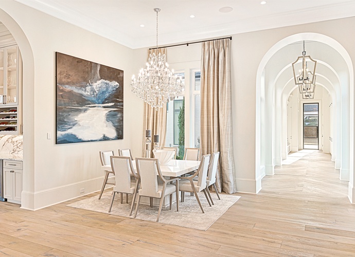 The walk to the kitchen rounds the dining area, where a custom marble table will sit until the end of time, says Greg: “It took nine guys to move that into here — it’s staying!” A contemporary crystal chandelier sparkles in front of a moody piece of modern art. Greg’s good friend Tony Mose, owner of the downtown New Orleans Esom Gallery, filled the rest of the home with his art which is edgy and modern, yet somehow feels timeless and soft within this space.