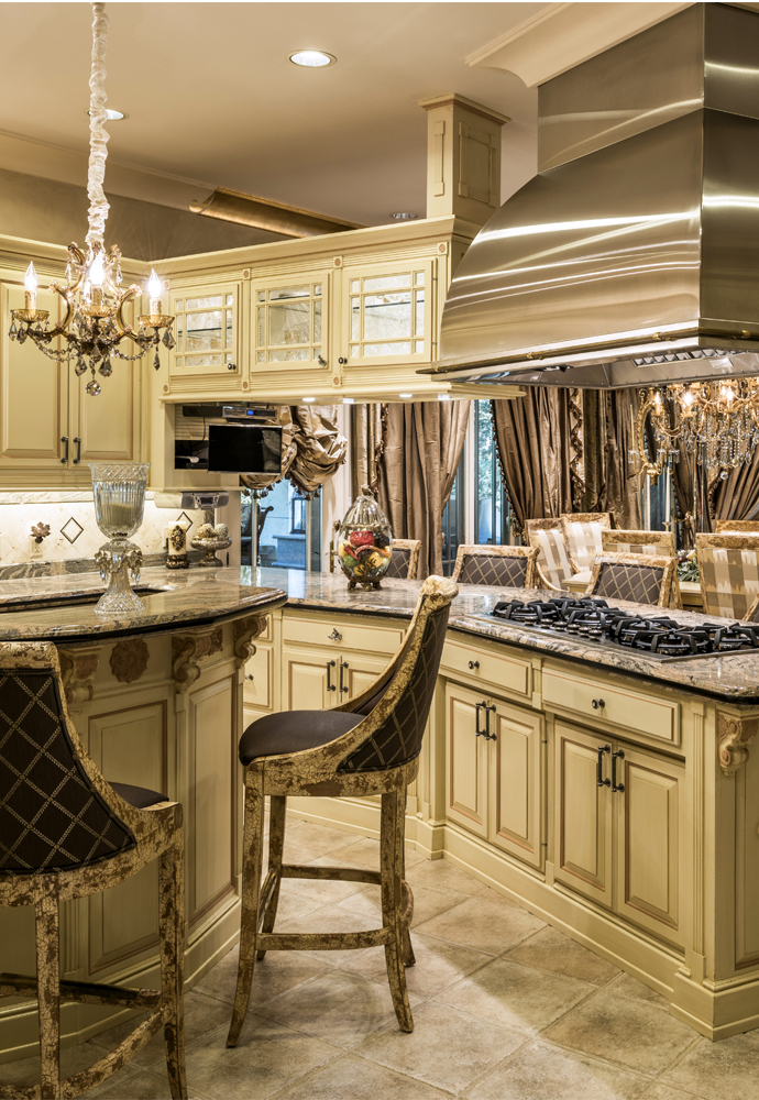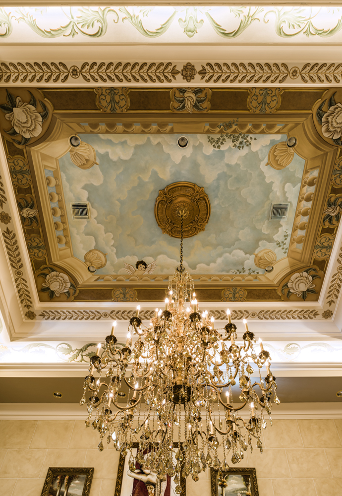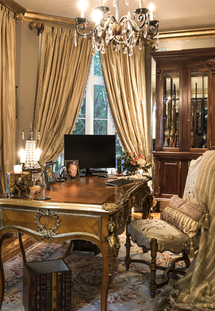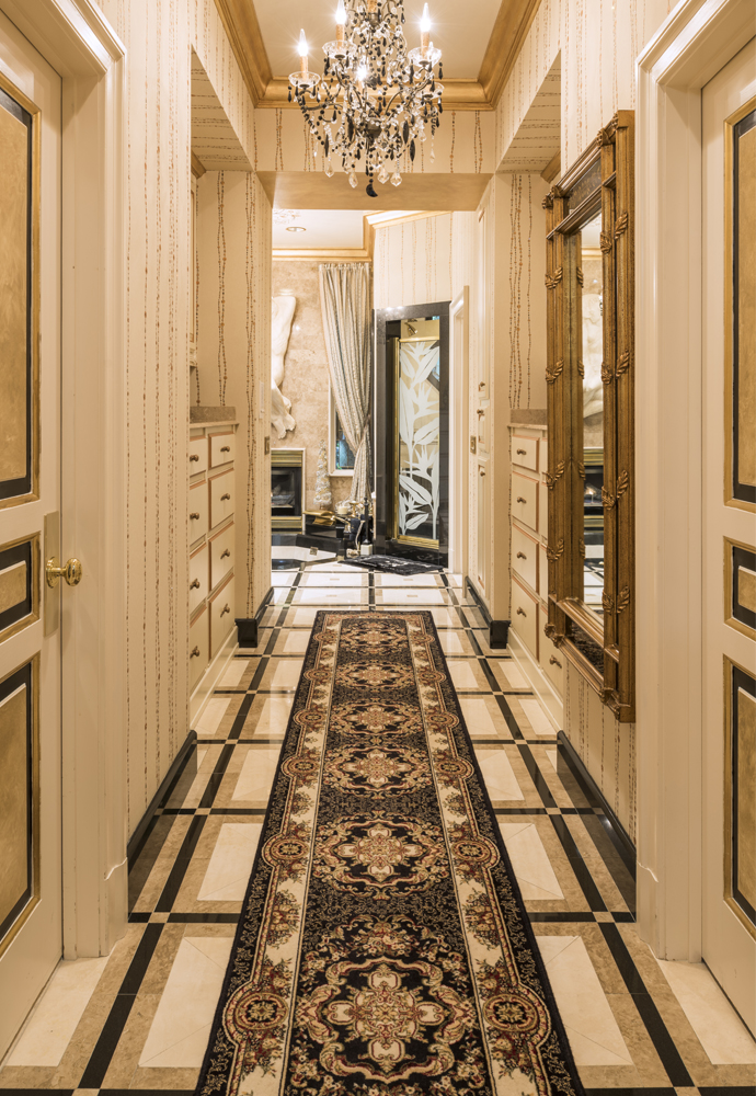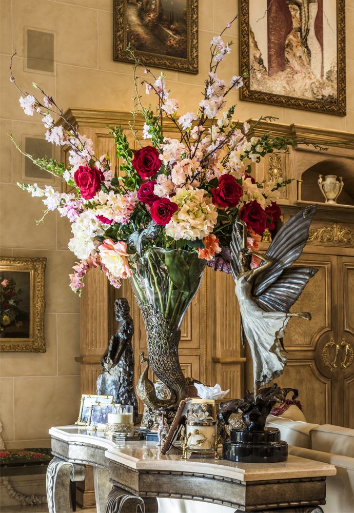 On the interior, Bellina confidently took on the design aspect of the project herself, carefully selecting the formal furnishings and luxurious custom touches found around every corner. She was intent on completing the Tuscan impression that the style of the home conveys. From exquisite materials on the walls, windows and floors to the incredible collection of art and sculptures, a step into the home is like a vacation abroad. Having visited a Las Vegas hotel property of close friend Steve Wyn, Bellina witnessed firsthand how perfectly constructed the signature elements of Italianate buildings could be. The work being done at the hotel was so exquisite that she brought home the idea for her master bathroom design. The paneled doors in that suite are now a sophisticated combination of cream, black and gold leaf that she first saw in Las Vegas. From the inlaid floors to the textured walls, the master suite is as well appointed as any five-star hotel. The magnificent four-poster bed was made to order in Italy and is complemented by symmetrical gilded mirrors over matching nightstands. Opulent silk draperies and custom bedding complete the world-class resort feeling. Even the guest suites are luxuriously appointed for anyone who is invited to rejuvenate themselves on the property.