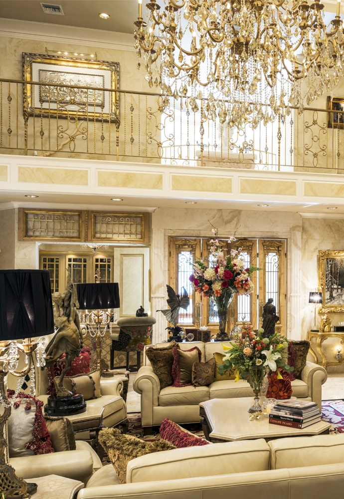 The double-height ceilings of the living room with iron-trimmed balconies above convey a luxe old-world look. Bellina dedicated months to commissioning custom draperies, elegant furnishings and artisan painting techniques, elevating the house from classic elegance to ultimate opulence.