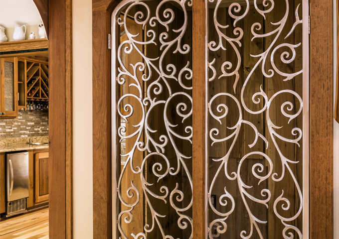 Every space in the home serves as a background to highlight Brett’s incredible metalworking talents. The kitchen and living rooms were reworked into one open space, with large, open cypress and aluminum trusswork soaring overhead. Scraped timber flooring made of hickory flows through the main living spaces, and handmade natural-color cherry cabinetry anchors the kitchen. The backsplash tiles even pick up on the touches of metal that appear everywhere else. Even the pantry doors feature scrolling aluminum designs handmade by Brett. One of the most unique features of the house is the light fixture that floats above the kitchen island. As thick as this slab of wood is, it’s a wonder to see it practically floating in the air. Made from a sunken cedar log pulled from the Atchafalaya basin, it provides the perfect warm, organic foil to all the sleek metalwork in the vicinity.
