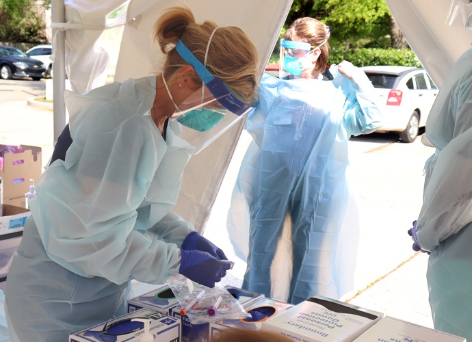 By Day-6 of the COVID outbreak, STHS quickly developed a unique action plan for drive-through testing by coordinating necessary resources in an involved but very worthwhile undertaking. Security, Grounds staff, Patient Registration staff and others now work together in a new way with redeployed nurses, some from closed physician offices, taking specimens for the test. At its height, 40-50 patients were being tested daily, never getting out of their cars. In conjunction, a call center was established to follow-up with tested patients.