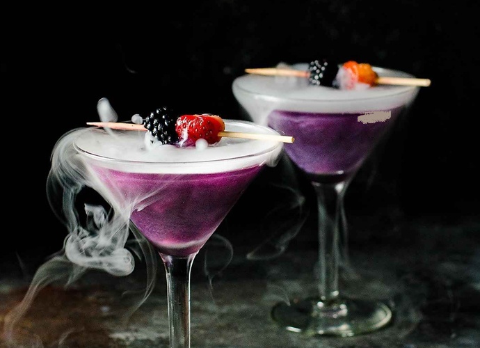 Put 1/2 teaspoon of powdered dry ice into a martini glass. Mix the apple brandy and blackberry liqueur in a shaker with ice and shake vigorously. Strain into a martini glass. Pour in 1 teaspoon of grenadine and let it sink to the bottom. Garnish with a blackberry and a strawberry